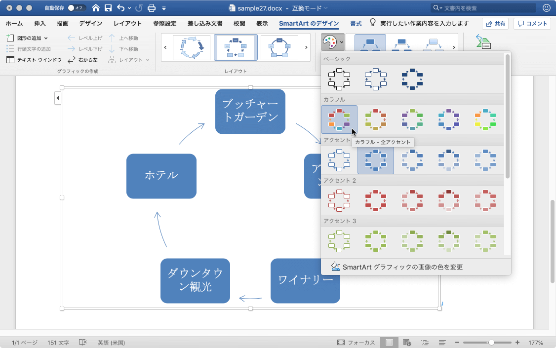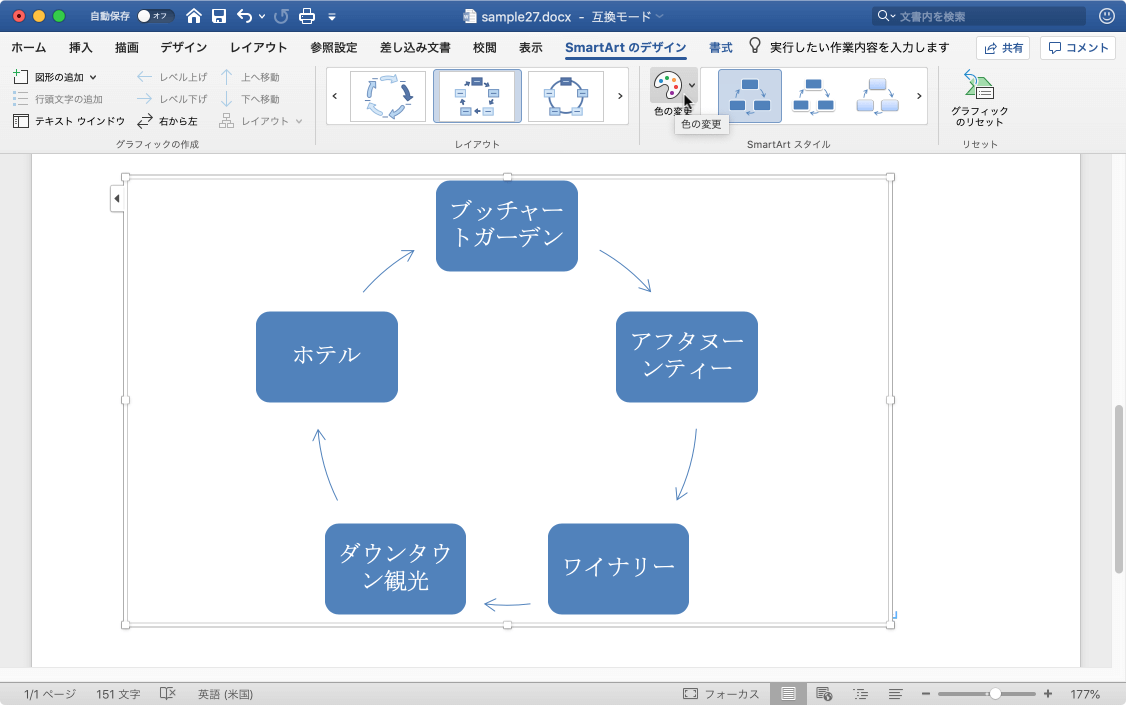 - [SmartArt スタイル]グループの[色の変更]をクリックします。