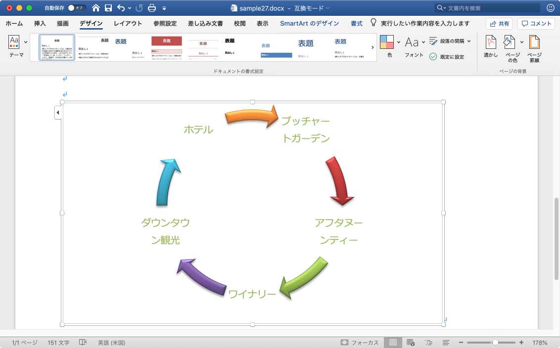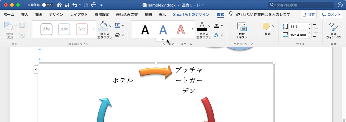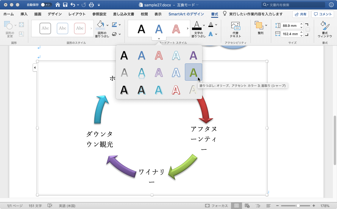 - SmartArtグラフィックの文字にワードアートスタイルが適用されました。