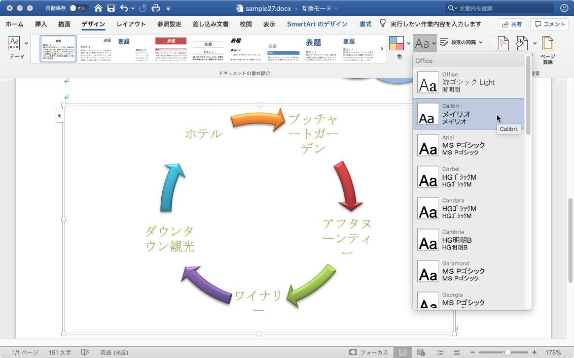 テーマのフォントが変更され、SmartArtグラフィックのフォントがそのテーマのフォントに適用されました。