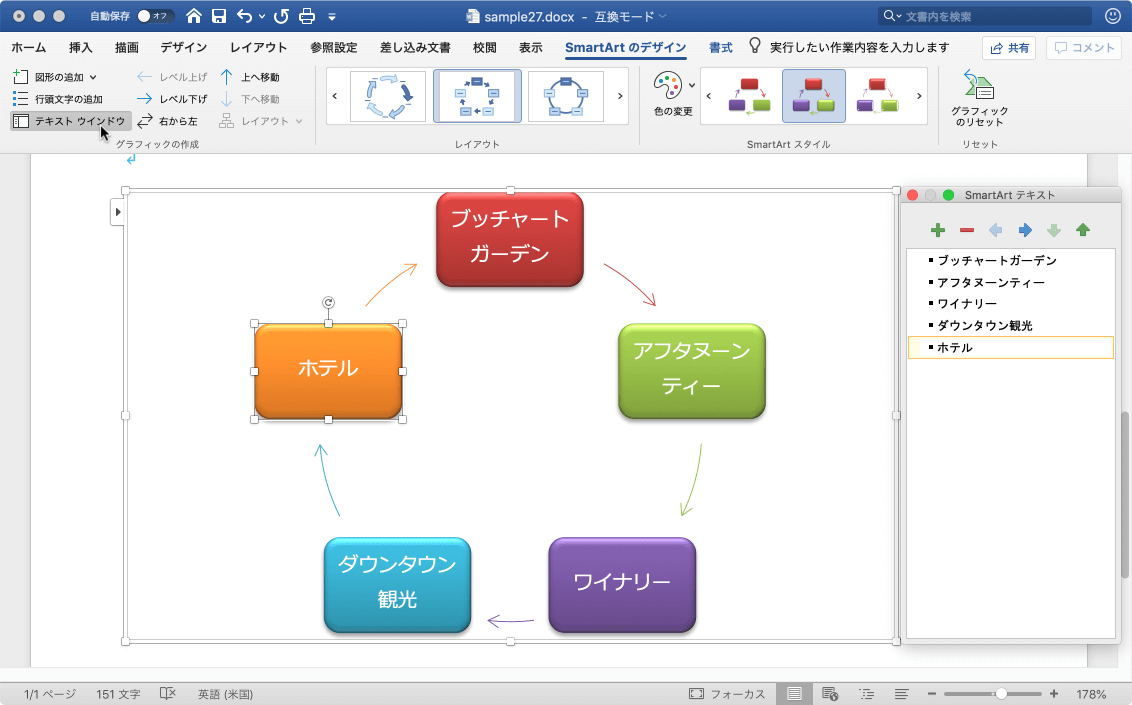 - テキスト ウィンドウを表示または非表示にします。テキスト ウィンドウでは、SmartArt グラフィック内のテキストの入力や構成ができます。