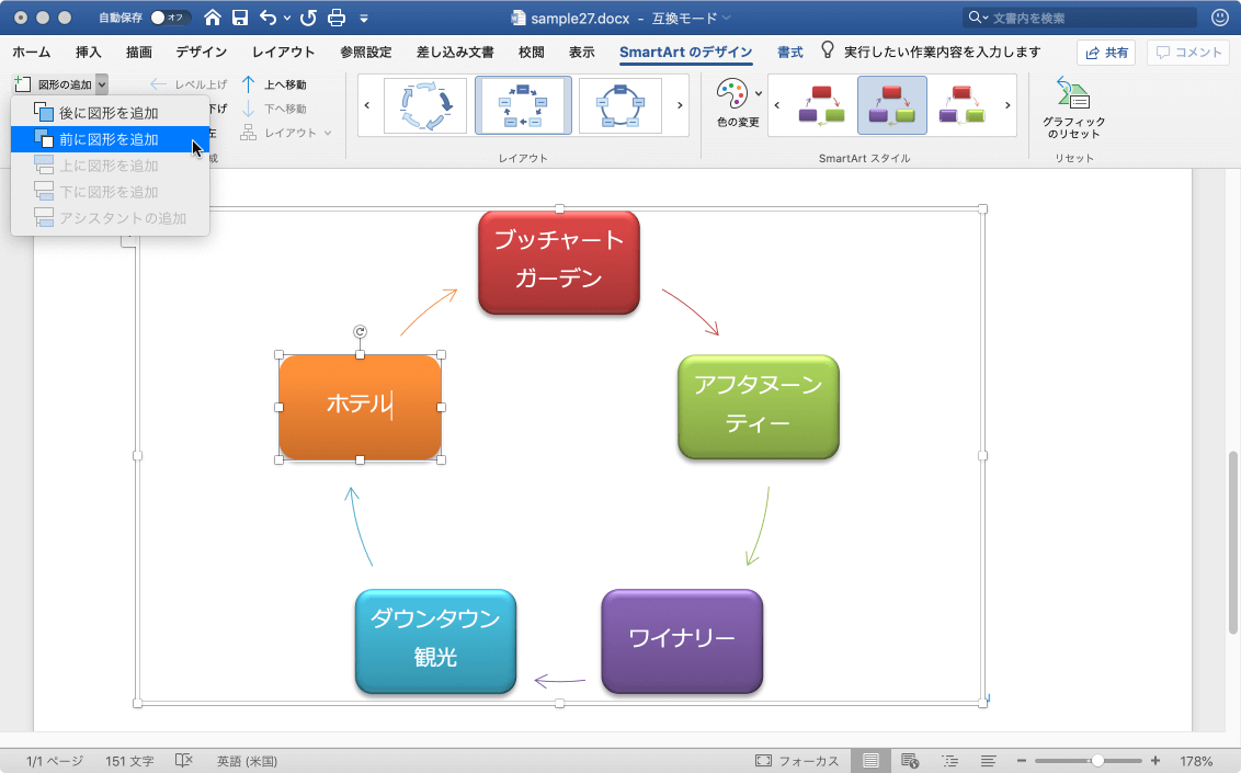 - SmartArt グラフィックに図形を追加します。既定では後に図形が追加されます。選択した図形の前に追加する場合は、▼をクリックして[前に図形を追加]を選択します。