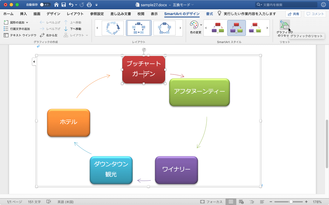 SmartArt グラフィックに対する書式変更をすべて取り消すには、SmartArtグラフィックを選択して[Smart Artのデザイン]タブの[SmartArtグラフィックのリセット]を選択します。