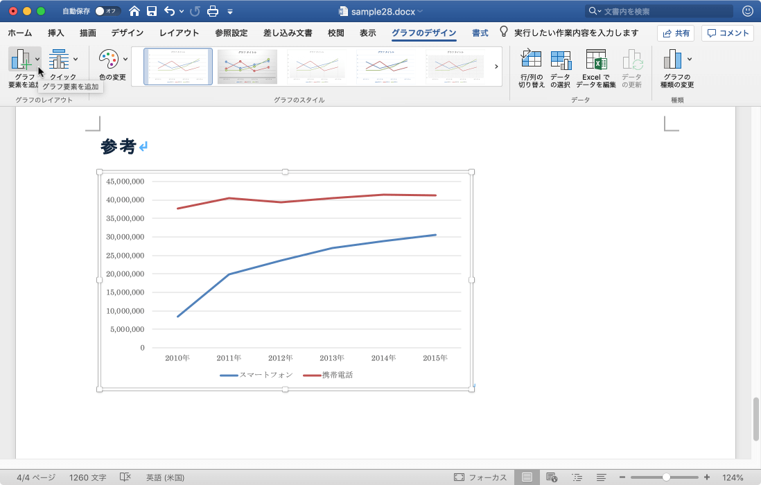 - グラフを選択し、[グラフのデザイン]タブを開きます。