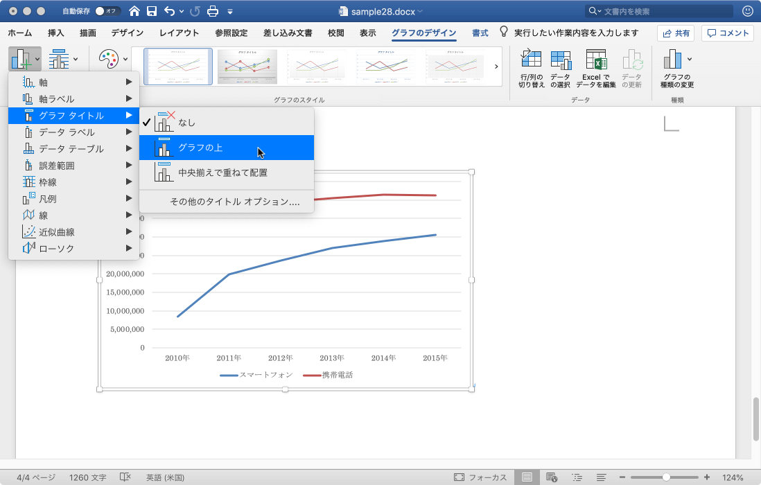 - 一覧から[グラフタイトル]をポイントしてグラフの配置場所を選択します。