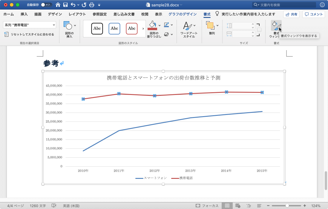 - 配色を変更したい系列を選択し、[グラフの書式]タブの[書式ウィンドウ]をクリックします。
