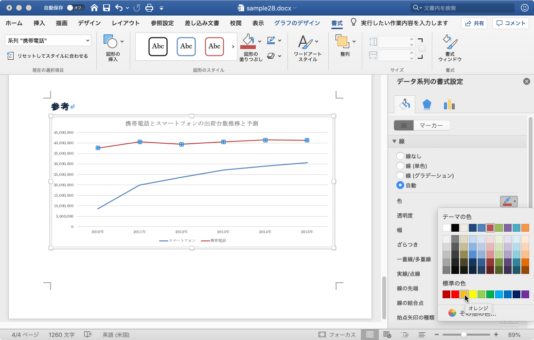 - 折れ線グラフの場合、[線]か[マーカー]のいずれかを選択します。線の色を変更するには[線]を開きます。