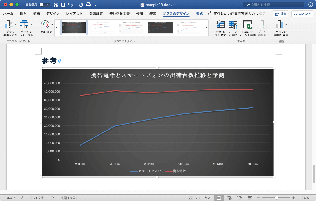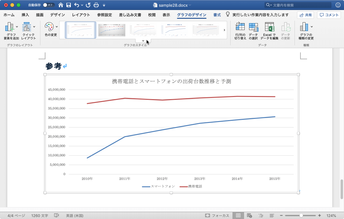 - グラフを選択して[グラフのデザイン]タブを開きます。