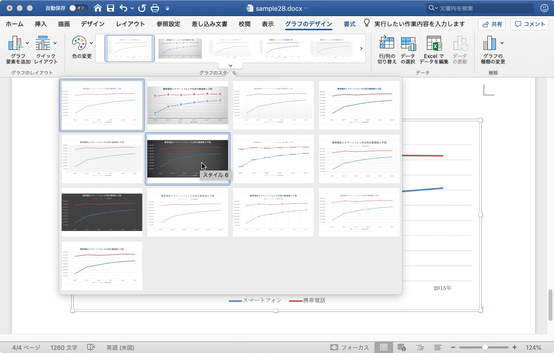 - [グラフスタイル]より適用したいスタイルを指定します。一覧表示するには下の[その他]をクリックするとOKです。