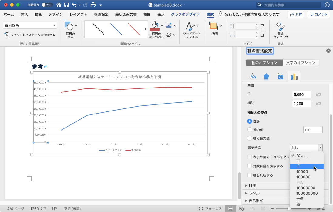 千単位で値軸を表示するには