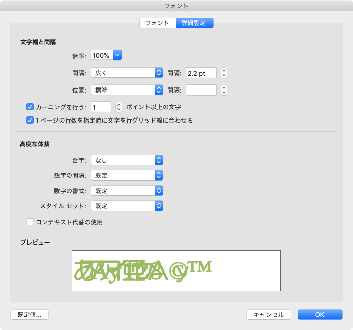 - [フォント]ダイアログボックスの[詳細設定]タブを開きます。