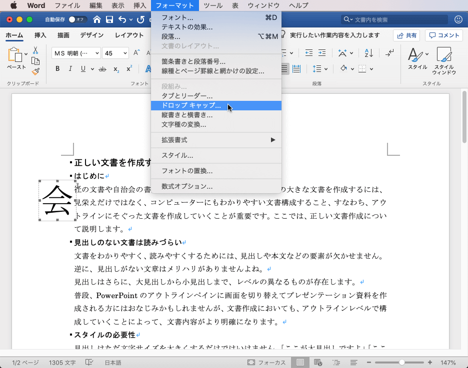 - 対象となる段落にカーソルを移動し、[フォーマット]メニューの[ドロップキャップ]を選択します。