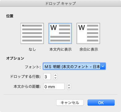 - 余白に表示されているので[ドロップキャップ]ダイアログボックスの[位置]オプションより[本文内に表示]を選択して[OK]ボタンをクリックします。