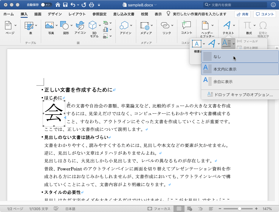 ドロップキャップの挿入