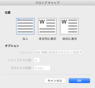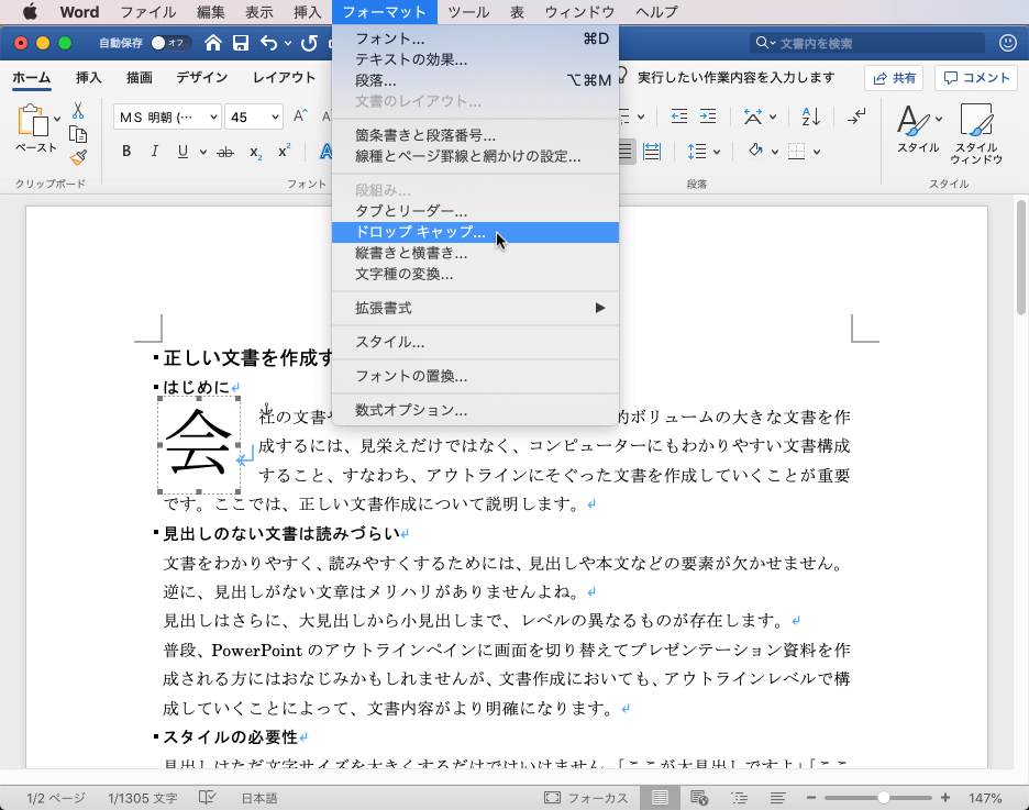 - 対象となる段落にカーソルを移動し、[フォーマット]メニューの[ドロップキャップ]を選択します。