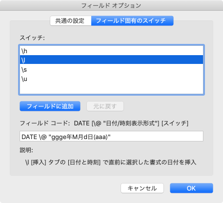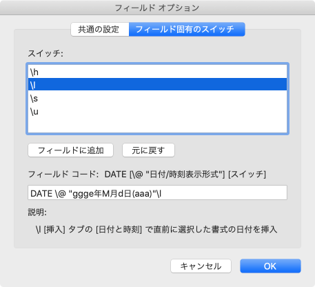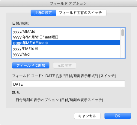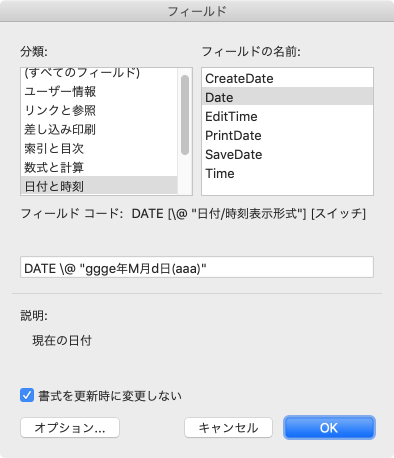 日付のフィールド オプションの固有のスイッチは、[フィールド]ダイアログボックスの[フィールド オプション]でチェックを付けることで簡単にスイッチを指定できます。