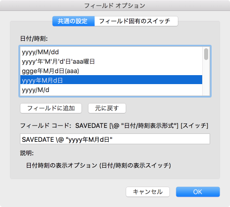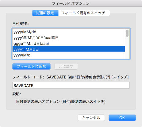 Word for Macの場合、作業中の文書プロパティの最終更新日時の挿入は、すべてフィールドの挿入でのみ行えます。挿入したい場所にカーソルを移動して[挿入]メニューの[フィールド]をクリック、もしくは[挿入]タブを開き[テキスト]グループの[フィールド]をクリックして、[日付と時刻]より[SaveDate]を選択します。