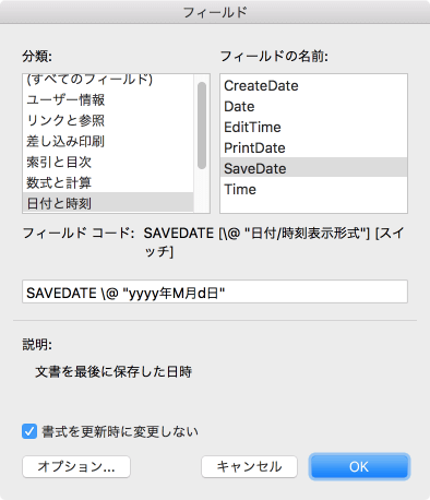 - [フィールド]ダイアログボックスの[日付と時刻]分類一覧より[SaveDate]を選択して[オプション]ボタンをクリックします。
