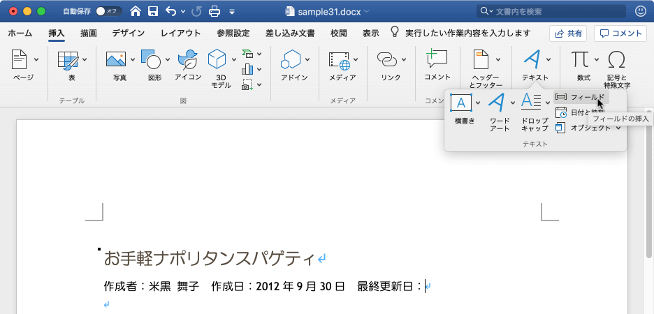 ここでは、文書の更新日時情報をフィールドで挿入する方法について説明します。