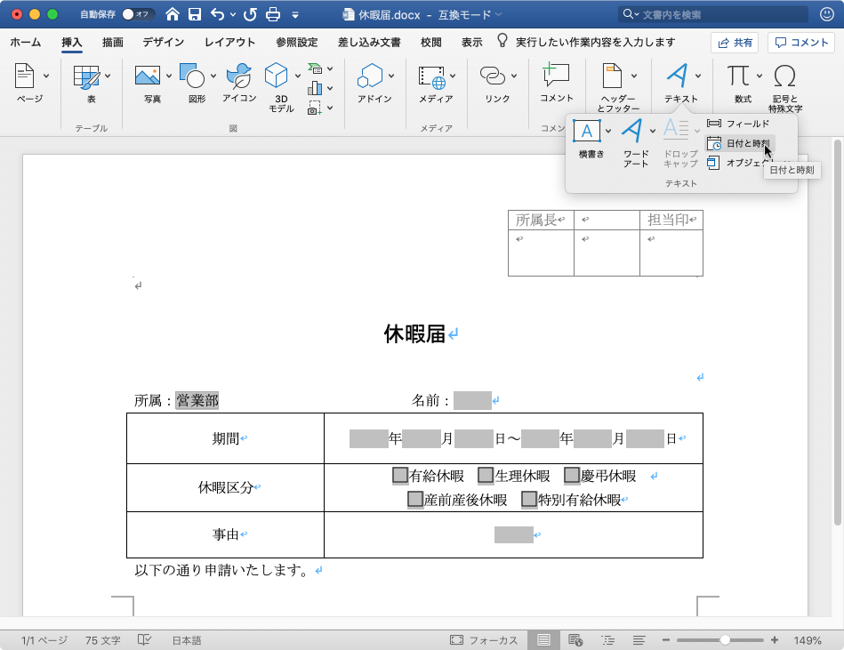 - 挿入したい場所にカーソルを移動し、[挿入]メニューの[日付と時刻]をクリックします。