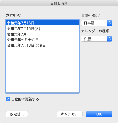 自動的に現在の日付や時刻に更新するには、[日付と時刻]ダイアログボックスの[自動的に更新する]にチェックを入れます。すると、フィールドとして挿入されます。