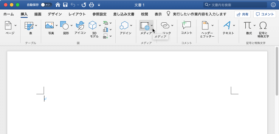 - [挿入]タブを開き、[メディア]をクリックします。