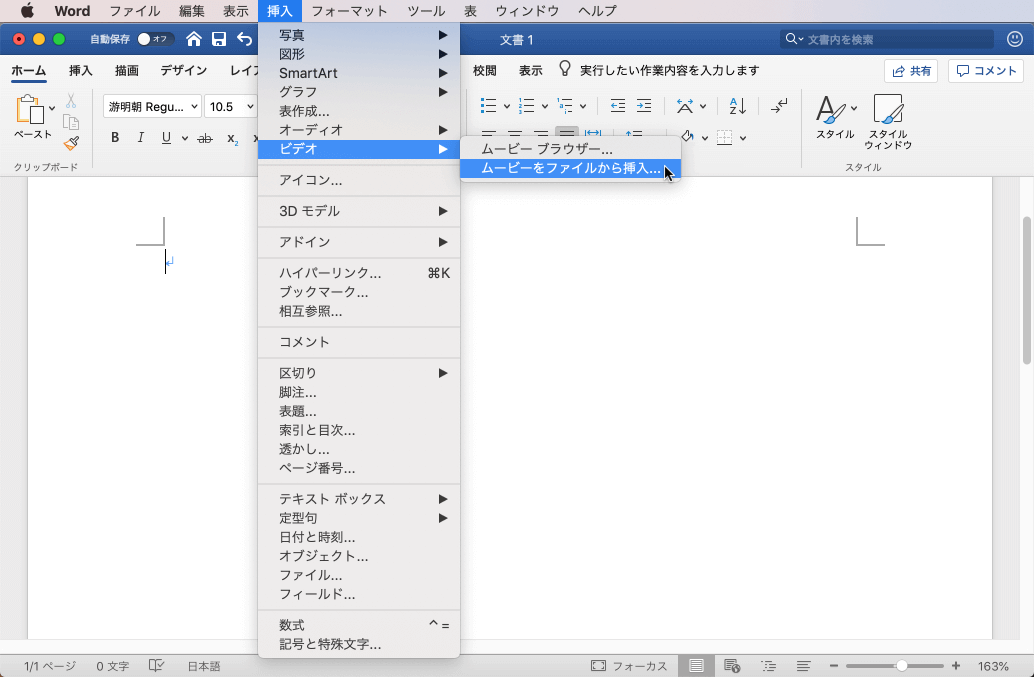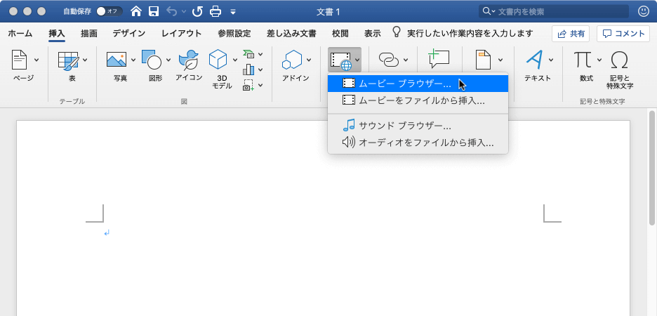 Mac内のムービーを文書に挿入することができます。[挿入]メニューの[ビデオ]をポイントして[ムービーブラウザー]または[ムービーをファイルから挿入]を選択、もしくは[挿入]タブを開き、[メディア]をクリックして[ムービーブラウザー]または[ムービーをファイルから挿入]を選択して、挿入するムービーを指定します。