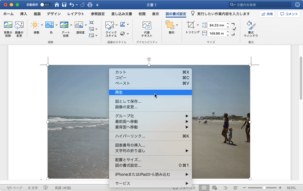 ムービーが文書に挿入されました。右クリックしてショートカットメニューより[再生]をクリックすると、ムービーが再生されます。