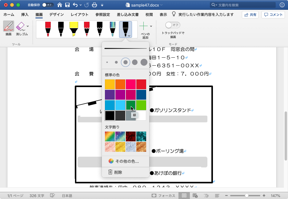 - 追加される既定のペンは黒の1mmです。▼をクリックしてペンの色や太さを指定します。