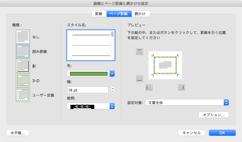 - [絵柄]ボックスから任意の絵柄や線の太さ、色を選択して、[オプション]ボタンをクリックします。