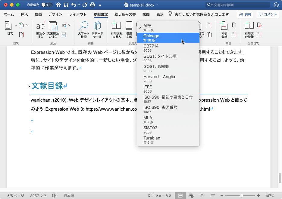文書の引用文献の一覧または文献目録に含まれるすべての引用文献のスタイルを、手動で文献目録のスタイルを編集することなく、一度に変更できます。たとえば、引用文献をAPAスタイルからChicagoスタイルに変更できます。引用文献の一覧または文献目録内にカーソルを移動して[参照設定]タブの[文献目録のスタイル]からスタイルを選択します。
