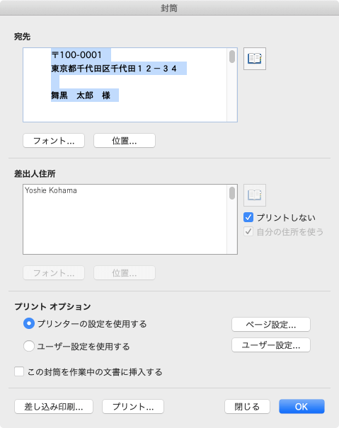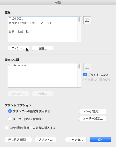 [封筒の作成]ダイアログボックスの[宛先]ボックスに宛先を入力して[フォント]ボタンをクリックすると、宛先のフォントを変更できます。英数字と日本語は別々のフォントなので注意してください。なお、[位置]ボタンで宛先や差出人住所の位置を調整することも可能です。