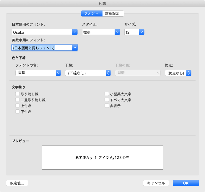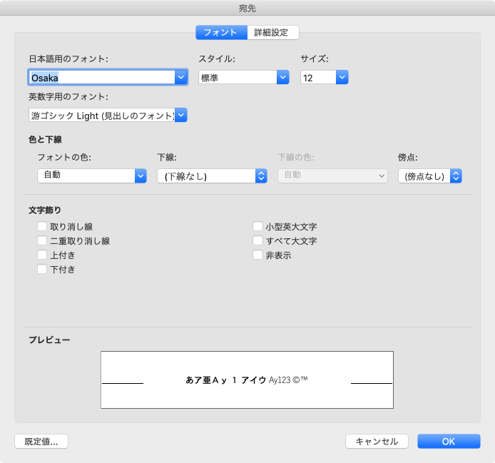 - 日本語用のフォントをOsakaに変えてみると、英数字が游ゴシック Lightのままになりました。