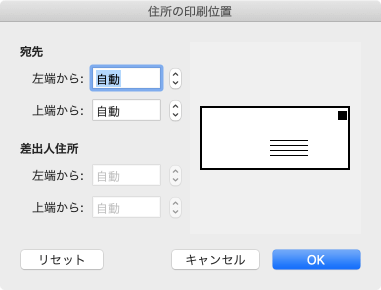 宛先や差出人住所の位置を調整する画面が表示されました。ここでは差出人住所をプリントしないように設定されているので、差出人住所が設定できないようになっています。