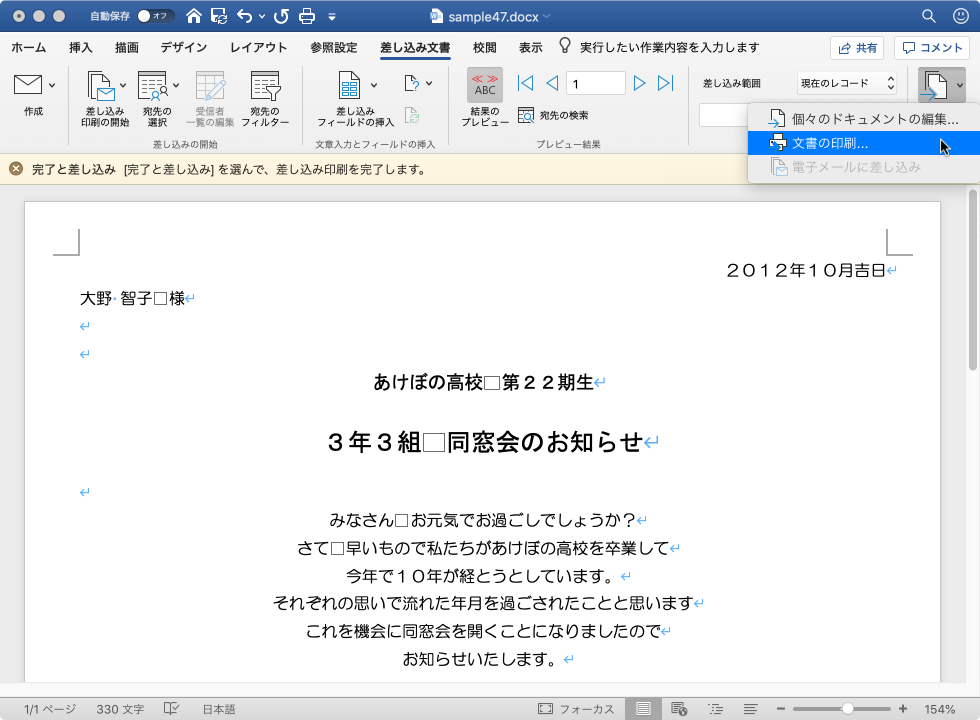 - 『差し込み印刷結果のプレビューを行うには』を参考にして結果のプレビューをオンにしておきます。