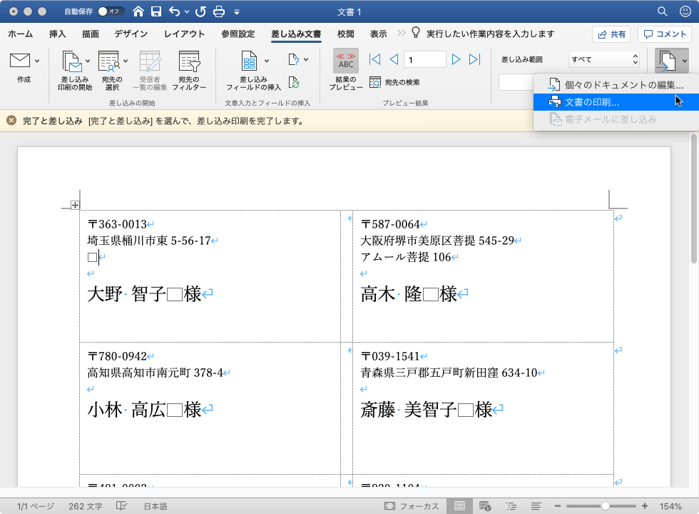 - [差し込み文書]タブの[完了と差し込み]を選択して、[文書の印刷]を選択します。