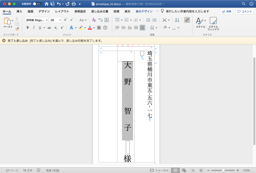 - 宛名フィールドを選択して、フォントサイズを28ポイントにします。