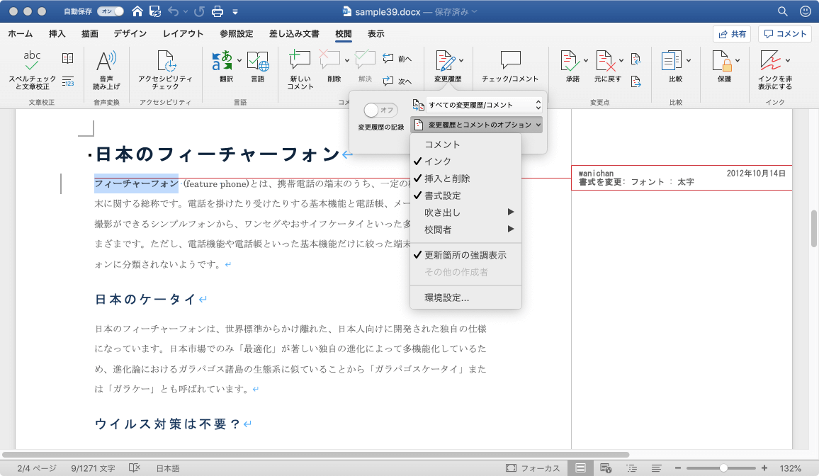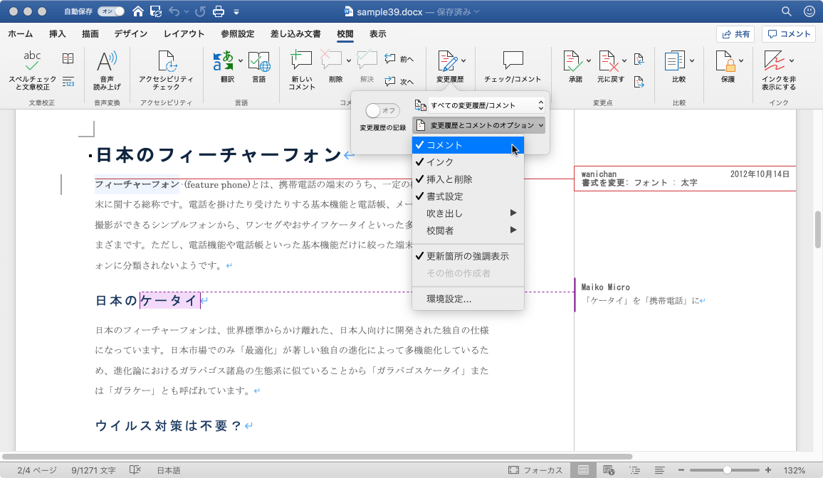 既定では、「コメント」「インク」「挿入と削除」「書式設定」すべての編集内容が表示されます。たとえばコメント以外の変更を確認したい場合、[校閲]タブの[変更履歴]グループにて、[変更履歴とコメントのオプション]から[コメント]のチェックをはずして、反映または元に戻します。