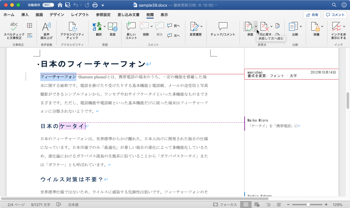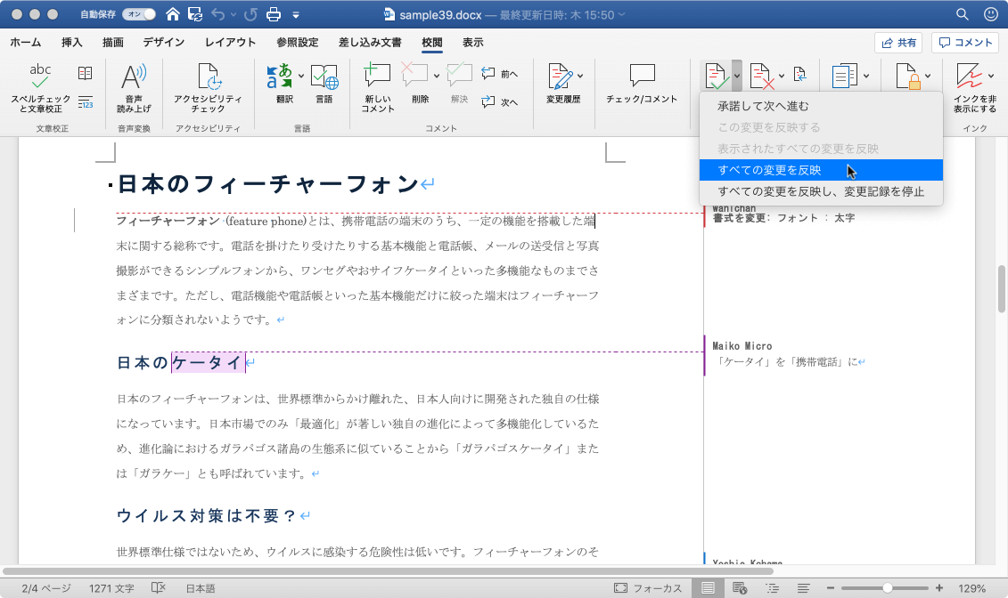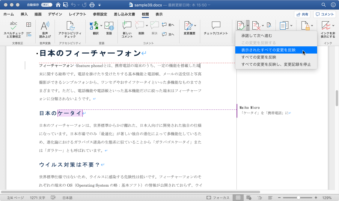 一部の校閲者や、一部の変更点の要素を表示している場合は、[承諾]オプションで[表示されたすべての変更を反映]コマンドが有効になります。