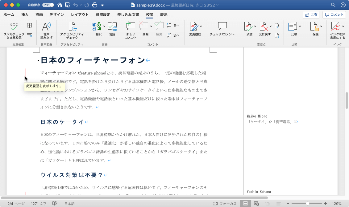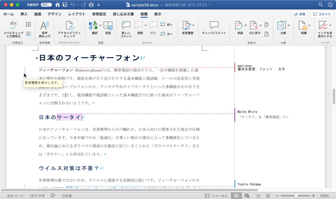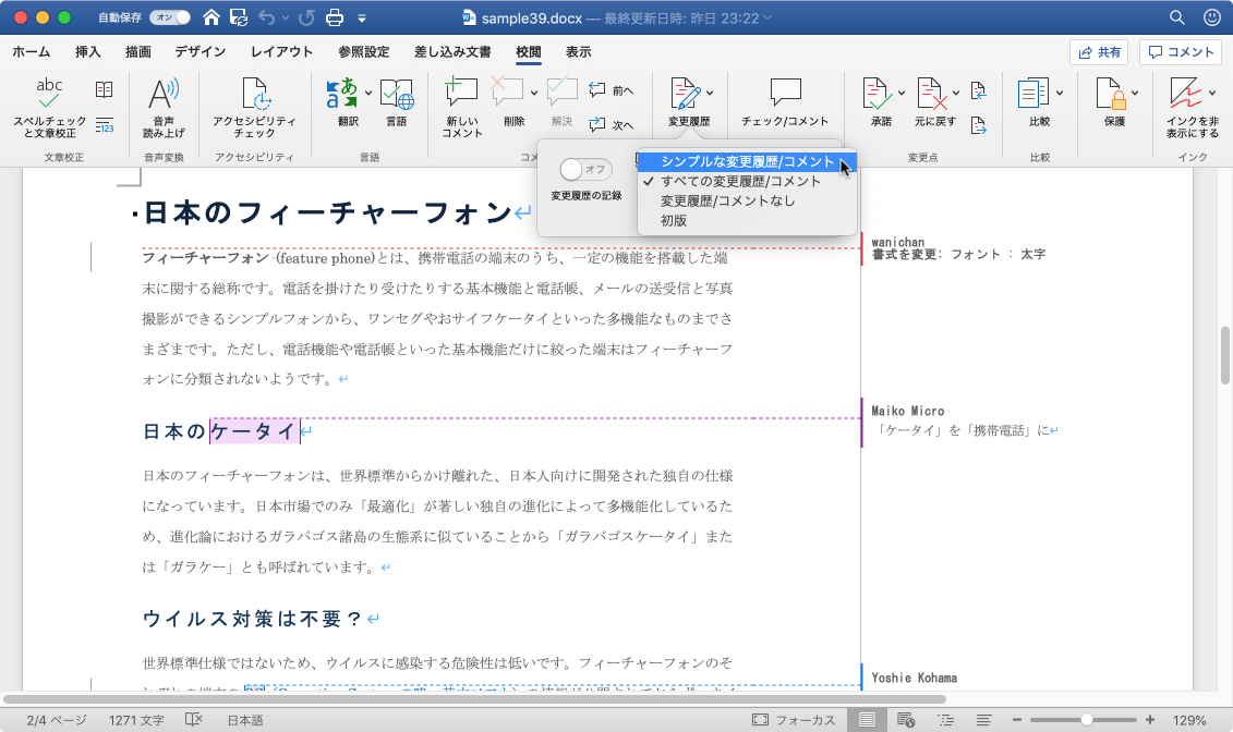 シンプルな変更履歴やコメントを表示するには