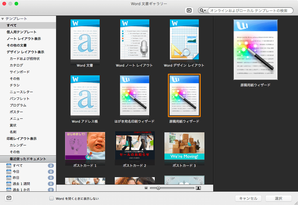 - [Word文書ギャラリー]から[原稿用紙ウィザード]を選択して[選択]ボタンをクリックします。