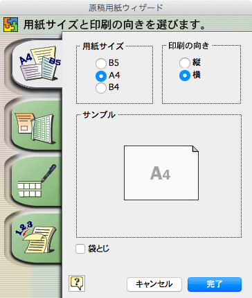 - 原稿用紙ウィザードが起動したら、用紙サイズと用紙の向きを選択します。