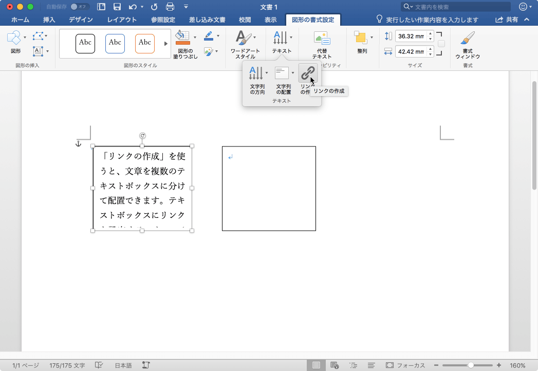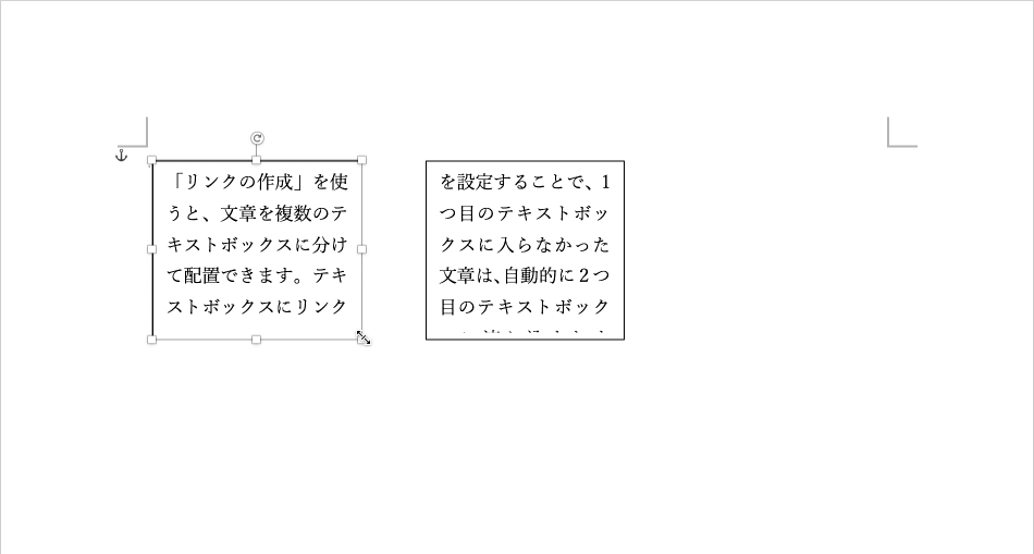 「リンクの作成」を使うと、文章を複数のテキストボックスに分けて配置できます。テキストボックスにリンクを設定することで、1つ目のテキストボックスに入らなかった文章は、自動的に2つ目のテキストボックスに流し込まれます。1つ目のテキストボックスのサイズを変更して表示できる文字数が変更されると、自動的に2つ目のテキストボックスにその続きが自動調整されます。