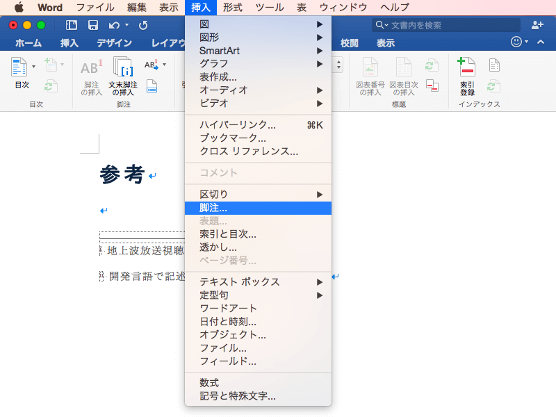 - [挿入]メニューの[脚注]を選択します。