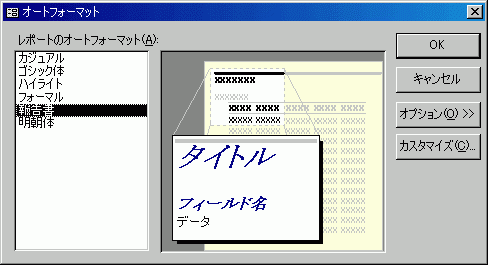 レポートのオートフォーマットのスタイルを選んで、OKボタンをクリックします。