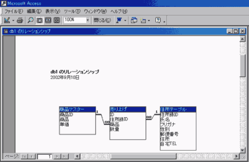 Access 2000でリレーションシップを印刷することもできます。データベースを開き、[ツール]メニューの[リレーションシップ]を選択、またはツールバーより[リレーションシップ]ボタンをクリックして、[ファイル]メニューの[リレーションシップの印刷]を選択します。
