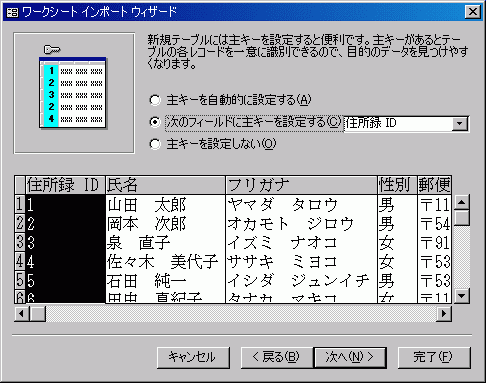 - 次に主キーを設定します。住所録IDを主キーと設定して、[次へ]ボタンをクリックします。