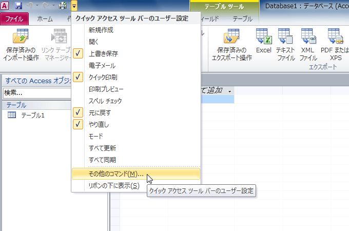クイックアクセスツールバーの▼をクリックし、[その他のコマンド]から追加したいコマンドを選択します。Accessのオプションダイアログボックスを開いて[クイックアクセスツールバー]からでも行えます。