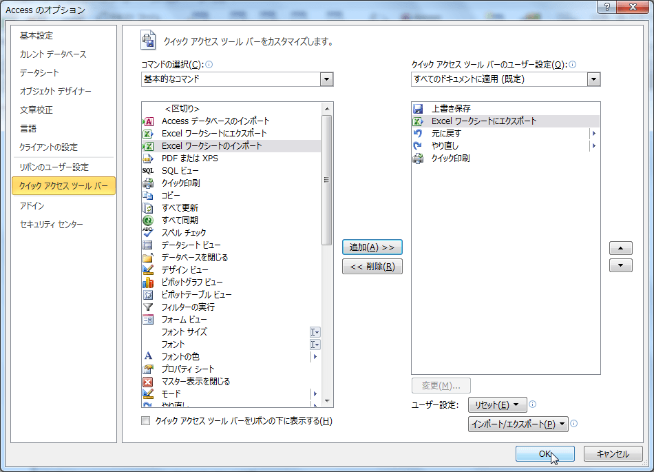- [Accessのオプション]ダイアログボックスの左側のコマンド一覧から追加したいコマンドを選択します。ここでは[Excelワークシートにエクスポート]を選択し、[追加]ボタンをクリックします。