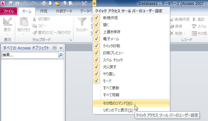 - クイックアクセスツールバーのカスタマイズメニューより[その他のコマンド]を選択します。