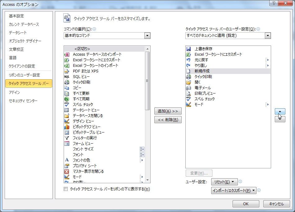 クイックアクセスツールバーに登録されているボタンを並べ替えるには、[Accessのオプション]ダイアログボックスの[クイックアクセスツールバー]を開いて、順序を変更したいコマンドを選択し[上へ]または[下へ]ボタンをクリックします。